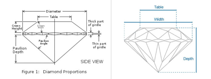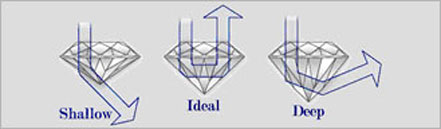 The cut of a diamond represents the proportions and finish. A diamond cut with the correct proportions and angles, also called "Well Cut", will refract the prism of light more efficiently, resulting in vibrant sparkle and brilliance. Less optimal cuts of diamonds result in less fire and sparkle. In a deep cut diamond, some light escapes through the side of the diamond. In a Shallow Cut diamond, light escapes through the bottom of the diamond.