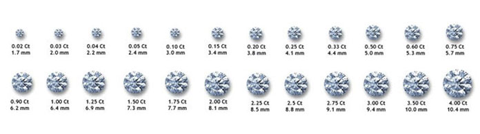 Diamonds and other gem stones are measured in carats, a word derived from 'carob' meaning seed, the first measuring unit for diamond traders.. One carat equals 200 milligrams of weight. The term 'carat' is often abbreviated to 'ct' and will refer to the weight of a single diamond. Carat TW or ct TW refers to total carat weight and is used to represent the weight of a number of diamonds that are presented together in one piece of jewellery. The word 'karat' is an expression of purity for gold. Below is a diagram of how carat weight is expressed :