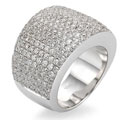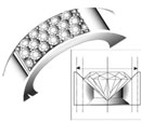 When the surface of a ring appears to be covered with tiny diamonds, the technique is called Pavé which means paved. It's an apt name because the surface looks a bit like a very pretty street paved with cobblestones. Tiny diamonds are placed in small holes that have been drilled out of the ring shank. On a band that does not taper across the top, each diamond should be exactly the same size. The diamonds are placed in rows, but in such a way that they fill as much of the space of the surface as is possible without actual touching. The more precisely cut the diamonds, the better the final appearance of the ring. Diamonds laid out in such a way that the entire surface of the ring looks like a glittering carpet of gems