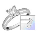 A prong setting is the one most often used to hold a solitaire. A prong setting puts the emphasis on the diamond and not the metal supporting it. The purpose of any setting is to hold the diamonds securely in the mounting and at the same time allow light to enter the diamonds for maximum brilliance. This is obviously a delicate balancing act. The more metal used to hold the diamonds, the more secure they are; the less metal used, the greater the chance for the diamond to reflect light. Very thin pieces of gold or platinum (the prongs) are used to hold the diamond securely in place. The diamond may be raised high up above the shank, to give it a larger, more important appearance, with only a suggestion of metal showing. In such a setting, the prongs are attached to the central setting of a ring, known as the head or basket. Each prong extends upward and outward from the head, arching over the diamond to form a secure grip.